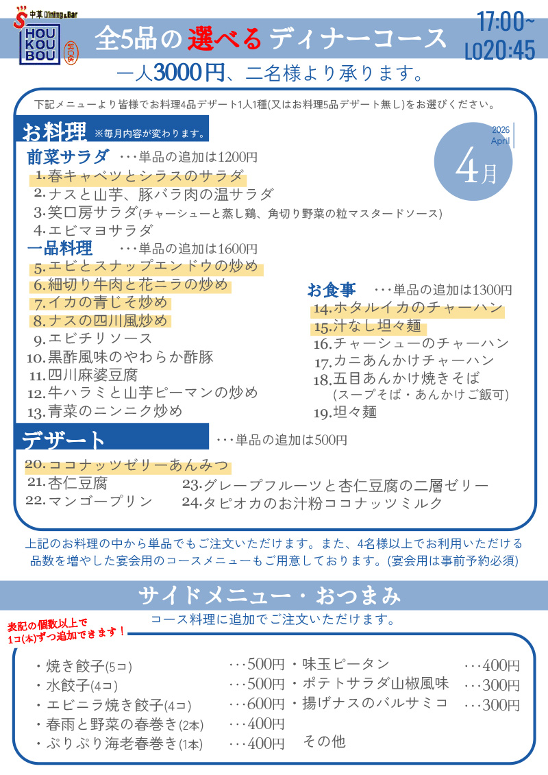 ディナータイムの4月のおすすめメニューはアメブロをご参照ください。